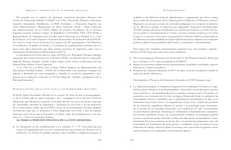 realidad es una Reforma Laboral, administrativa y empresarial, que eleva a rango de ley todas las afectaciones de la Alianza por la Calidad de la Educación contra el Magisterio; por no que no tiene un contenido pedagógico y no respetar los derechos de los Maestros; porque es impuesta por organismos financieros internacionales (OCDE); porque privatiza la Educación con el pretexto de involucrar a los Padres de Familia en la gestión y el mantenimiento de las Escuelas, se permite la entrada de empresas a los Centros Escolares y se convierte en letra muerta la gratuidad de la Educación Pública; y, porque finca en los Maestros la responsabilidad de la baja calidad educativa e impone una evaluación punitiva, elude la responsabilidad del Estado, es excluyente y discriminatoria. Para lograr una verdadera transformación educativa con valor humano, cultural y social, la CNTE exige ente otras cosas, que el gobierno: • Eleve el presupuesto Educativo, de menos del 4% del Producto Interno Bruto que hoy se destina, al 12% que recomienda la UNESCO. • Repare las precarias condiciones de infraestructura, mobiliario, tecnología, espacios deportivos y técnico-científicos. • Garantice la Cobertura Educativa al 100% de niños y jóvenes en edad de estudiar en todos los niveles educativos. Para impulsar el Proyecto de Educación Alternativa, la CNTE propone que: • La Educación propicie la formación integral de los estudiantes; Promueva la equidad de género; Respete la multiculturalidad y diversidad social; Recupere nuestras raíces históricas y de identidad; Rescate la relación armónica entre el hombre y la naturaleza en el contexto de la crisis ecológica; Desarrolle desde lo endógeno las comunidades, barrios y entidades ante la globalización mercantilista; Se base en el humanismo para hacer frente a la degradación social, ética y espiritual, producto de las relaciones capitalistas; Retome la ciencia y la tecnología como herramientas al servicio de las mayorías, mejorando sus condiciones de vida y acrecentando el conocimiento universal; Anteponga la solidaridad al individualismo competitivo del modelo neoliberal; Forme en el pensamiento holístico, la inteligencia global, creativa, emocional, crítica, filosófica y lúdica; Sea liberadora, emancipadora y transformadora; Forje la conciencia social, de clase y la pertenencia planetaria a una sola humanidad, sin distinciones de raza, género o condición social; Construya nuevas relaciones de trabajo colectivas desde la escuela, como una forma de generar socialmente la riqueza, sin explotación, ni dominación alguna. 130