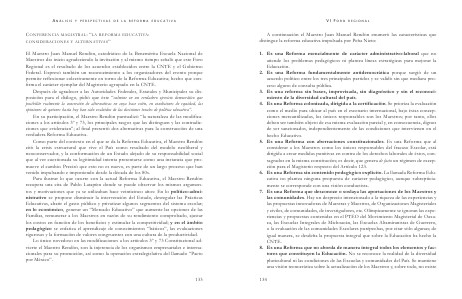 A continuación el Maestro Juan Manuel Rendón enumeró las características que distingue la reforma educativa impulsada por Peña Nieto: 1. Es una Reforma esencialmente de carácter administrativo-laboral que no atiende los problemas pedagógicos ni plantea líneas estratégicas para mejorar la Educación. 2. Es una Reforma fundamentalmente antidemocrática porque surgió de un acuerdo político entre los tres principales partidos y se validó sin que mediara proceso alguno de consulta pública. 3. Es una reforma sin bases, improvisada, sin diagnóstico y sin el reconocimiento de la diversidad cultural del país. 4. Es una Reforma colonizada, dirigida a la certificación. Se prioriza la evaluación como el medio para ubicar al país en el escenario internacional, bajo éstas concepciones mercantilizadas, los únicos responsables son los Maestros; por tanto, ellos deben ser también objeto de esa misma evaluación parcial y, en consecuencia, dignos de ser sancionados, independientemente de las condiciones que intervienen en el hecho Educativo. 5. Es una Reforma con aberraciones constitucionales. Es una Reforma que al considerar a los Maestros como los únicos responsables del fracaso Escolar, está dirigida a crear medidas punitivas en contra de los derechos laborales de éstos, consagrados en la misma constitución; es decir, que genera de facto un régimen de excepción para el Magisterio respecto del Artículo 123. 6. Es una Reforma sin contenido pedagógico explícito. La llamada Reforma Educativa no plantea ninguna propuesta de carácter pedagógico, aunque subrepticiamente se corresponde con una visión conductista. 7. Es una Reforma que desconoce o soslaya las aportaciones de los Maestros y las comunidades. Hay un desprecio intencionado a la riqueza de las experiencias y las propuestas innovadoras de Maestras y Maestros, de Organizaciones Magisteriales y civiles, de comunidades, de investigadores, etc. Olímpicamente se ignoran las experiencias y propuestas contenidas en el PTEO del Movimiento Magisterial de Oaxaca, las Escuelas Integrales de Michoacán, las Escuelas Altamiranistas de Guerrero, o la evaluación de las comunidades Escolares purépechas, por citar sólo algunas; de igual manera, se desdeña la propuesta integral que sobre la Educación ha hecho la CNTE. 8. Es una Reforma que no aborda de manera integral todos los elementos y factores que constituyen la Educación. No se reconoce la realidad de la diversidad pluricultural ni las condiciones de las Escuelas y comunidades del País. Se mantiene una visión tecnocrática sobre la actualización de los Maestros y, sobre todo, no existe 134