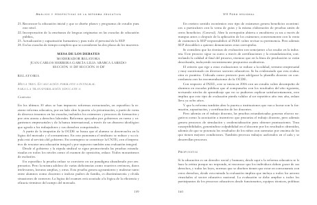 Si la educación es un derecho social y humano, desde aquí a la reforma educativa se le hace la critica porque no responde, ni reconoce que los individuos deben gozar de sus derechos, y todas las leyes, normas que se diseñen tienen que estar en consonancia con estos derechos, desde esta mirada la evaluación implica que incluya a todos los actores vinculados al sector educativo nacional. La evaluación se debe ampliar a todos los participantes de los procesos educativos desde funcionarios, equipos técnicos, políticas 160