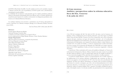 A las 9:50 de la mañana del día 9 de julio de 2013, da inicio, con los honores a la bandera, el Foro “Implicaciones de la reforma educativa”, que tiene lugar en el Word Trade Center de Boca del Rio, Veracruz. Este Foro, al igual que otros ocho en distintas regiones del país, constituye un logro del magisterio nacional y de la Coordinadora Nacional de Trabajadores de la Educación, que con sus movilizaciones negociaron con la Secretaría de Gobernación, estos espacios de reflexión, debate y crítica, abiertos a la sociedad civil, a los padres de familia y a todas las organizaciones sociales interesadas. Los foros cuentan con la presencia del delegado de la SEGOB en el estado, representantes de la CNTE, legisladores locales, así como los ponentes magistrales y relatores nacionales. La profesora. Olivia, moderadora del evento, da la palabra al delegado en Veracruz de la Secretaría de Gobernación, Maestro Alberto Amador Leal, quien sostiene la necesidad de abrir canales de dialogo, ya que no puede haber nada que nos impida escucharnos, y con esa convicción inaugura el Foro, para bien de los maestros y la niñez mexicana. La profesora Sandra Romero expone el posicionamiento de la CNTE respecto a las implicaciones de la reforma educativa, estableciendo que constituye un claro retroceso con respecto a la Constitución de 1917. Este foro nace de la movilización del magisterio. El Pacto por México desmantela a la nación como un botín económico, que incluye los recursos estratégicos, por ello se da un desmantelamiento de la infraestructura educativa y la educación en general. En este contexto la privatización de la educación vulnera el carácter público, laico y gratuito. El modelo neoliberal ha provocado el desempleo masivo. La reforma encubre una penetración de las corporaciones 178