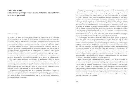 El pasado 2 de mayo la Coordinadora Nacional de Trabajadores de la Educación (CNTE) entregó a la Secretaría de Gobernación diversos documentos, entre ellos el titulado “Hacia la educación que necesitamos los mexicanos”. Seis días después, en las oficinas de esta secretaría se celebró una reunión en la que participaron el Subsecretario de Gobierno, dos subsecretarios de la Secretaría de Educación Pública y una amplia representación de la CNTE integrada por tres secretarios generales de secciones del SNTE y representantes de otras diez secciones. En esta reunión, el Gobierno Federal, representado por el subsecretario de Gobierno, Luis Enrique Miranda Nava y la CNTE, acordaron convocar a la realización de una serie de “Foros sobre la reforma educativa”, a los que se invitó a participar “a los padres de familia, a representantes de organizaciones de la sociedad, a académicos e investigadores, empresarios, representantes populares, representantes de los medios de comunicación y a todos aquellos interesados en el mejoramiento de la educación pública en nuestro país”. En esa misma convocatoria conjunta, se definió el programa conforme al cual se realizaron nueve foros regionales, en igual número de ciudades del país, al cual se agregaron 2 foros estatales más en Puebla y el Estado de México; en las cuales se congregaron participantes de las entidades cercanas; hoy se realiza el último foro de ese programa, titulado “Foro nacional” en esta Ciudad de México. De acuerdo con lo convenido por la representación del Gobierno Federal y la CNTE, los resultados de dichos foros, re copilados y ordenados por relatores locales y uno nacional, se plasmarían en un documento que la Secretaría de Gobernación entregará “a las instancias legales correspondientes para su procesamiento”. Esta relatoría es un avance de ese documento. 207