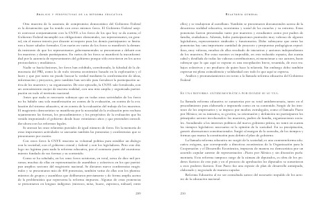 ellos) y se tradujeron al castellano. También se presentaron documentales acerca de la desastrosa realidad educativa, económica y social de las escuelas y su entorno. Estas ponencias fueron presentadas tanto por maestros y estudiantes como por padres de familia, ciudadanos. Además, hubo participaciones puntuales muy valiosas de algunos legisladores, representantes sindicales y funcionarios. Debe subrayarse que entre las ponencias hay una importante cantidad de proyecto y propuestas pedagógicas específicas, muy valiosas, muchas de ellas resultado de iniciativas y acciones independientes de los maestros. Por estas razones es imposible, en este reducido espacio, dar cuenta cabal y detallada de todas las valiosas contribuciones, ni mencionar a sus autores, baste subrayar que lo que aquí se expone es una recopilación breve, resumida, de esos trabajos colectivos y no producto de quien hace la relatoría. Sin embargo debo también expresar mi plena coincidencia y solidaridad con todo lo que aquí se expresa. Análisis y pronunciamientos en torno a la llamada reforma educativa del Gobierno Federal