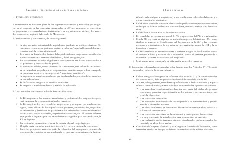 C. Propuestas y demandas consensadas sobre la reforma a los Artículos 3º y 73 constitucionales y sobre la Reforma Educativa • Deben abrogarse/derogarse las reformas a los artículos 3º y 73 constitucionales. En consecuencia, debe suspenderse toda medida vinculada con la RE. • A la par, debe generarse, extenderse y profundizarse el Debate nacional y popular sobre el tema educativo; mismo que debe contemplar las siguientes cuestiones: ? Una verdadera transformación educativa que parta del núcleo del proceso educativo y garantice la participación de los actores y fuerzas más importantes de la educación. ? educación humanista. Una ? Una educación contextualizada que responda a las características y problemas de la diversidad nacional. ? educación basada en la memoria histórica de nuestro pueblo, abierta a la Una cultura y al conocimiento. ? educación sustentada en la autonomía y participación democrática. Una ? programa serio de actualización para los maestros en servicio. Un ? evaluación cualitativamente distinta, situada en los problemas reales, hoUna rizontal y de abajo hacia arriba. • Constituir el Congreso Nacional y los Congresos Estatales de Educación, como instancias amplias en las que se definan los términos de la política educativa. 88