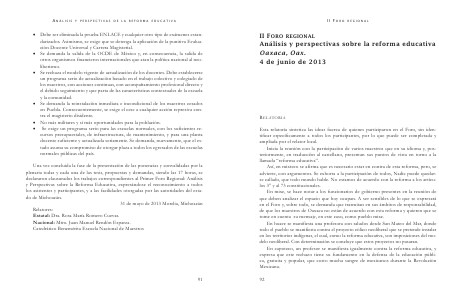 • Debe ser eliminada la prueba ENLACE y cualquier otro tipo de exámenes estandarizados. Asimismo, se exige que se detenga la aplicación de la punitiva Evaluación Docente Universal y Carrera Magisterial. • Se demanda la salida de la OCDE de México y, en consecuencia, la salida de otros organismos financieros internacionales que atan la política nacional al neoliberismo. • Se rechaza el modelo vigente de actualización de los docentes. Debe establecerse un programa serio de actualización basado en el trabajo colectivo y colegiado de los maestros, con acciones continuas, con acompañamiento profesional directo y el debido seguimiento y que parta de las características contextuales de la escuela y la comunidad. • Se demanda la reinstalación inmediata e incondicional de los maestros cesados en Puebla. Consecuentemente, se exige el cese a cualquier acción represiva contra el magisterio disidente. • No más militares y sí más oportunidades para la población. • Se exige un programa serio para las escuelas normales, con los suficientes recursos presupuestales, de infraestructura, de mantenimiento, y para una planta docente suficiente y actualizada seriamente. Se demanda, nuevamente, que el estado asuma su compromiso de otorgar plaza a todos los egresados de las escuelas normales públicas del país. Una vez concluida la fase de la presentación de las ponencias y convalidadas por la plenaria todas y cada una de las tesis, propuestas y demandas, siendo las 17 horas, se declararon clausurados los trabajos correspondientes al Primer Foro Regional: Análisis y Perspectivas sobre la Reforma Educativa, expresándose el reconocimiento a todos los asistentes y participantes, y a las facilidades otorgadas por las autoridades del estado de Michoacán. 31 de mayo de 2013 Morelia, Michoacán Relatores: Estatal: Dra. Rosa María Romero Cuevas. Nacional: Mtro. Juan Manuel Rendón Esparza. Catedrático Benemérita Escuela Nacional de Maestros