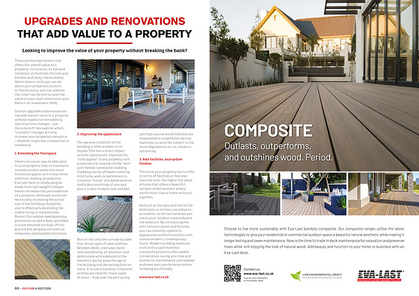 There’ s no easier way to add value to your property than to transform unused outdoor areas into more functional spaces with a few clever additions. Adding an exquisite Eva-Last deck or shady pergola made from lightweight Lifespan beams increases the perceived size of a property. Although you’ re not technically increasing the actual size of the building’ s footprint, you’ re effectively extending the usable living or working area. Bonus! You seldom need planning permission to add a deck, provided it is not elevated too high off the ground and pergolas are seem as temporary removeable structures.