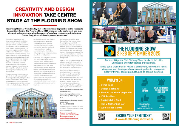 The event doesn’ t just showcase products- it offers a wealth of learning and skill-building too. The highly anticipated Demo Zone, hosted by the Flooring Industry Training Association( FITA), returns with a packed schedule of handson demonstrations and expertled masterclasses. Whether you’ re a fitter keen to refine your installation techniques or a retailer wanting firsthand understanding of product performance, the Demo Zone delivers practical insights that can transform your business.