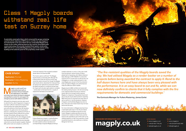A potentially catastrophic blaze, which consumed the garage containing a parked vehicle adjoining a £ 1M house in rural Surrey, was stopped in its tracks thanks to the use of 12mm A1 non combustible Magply being chosen as the render substrate board on the contract, the property was constructed using a Structurally Insulated Panel system construction( SIP) with A1 non-combustible Magply being used on the exterior of the building as the substrate panel for the proprietary render system.