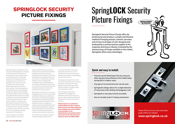 Springlock Security Picture Fixings offer, the professional and amateur, a simple and effective method of hanging pictures, artwork, canvases and mirrors to all types of wall. Designed and produced by a contract picture supplier to the corporate and leisure industry, frustrated by the shortcomings of fixings available on the market, Springlock offers many advantages.