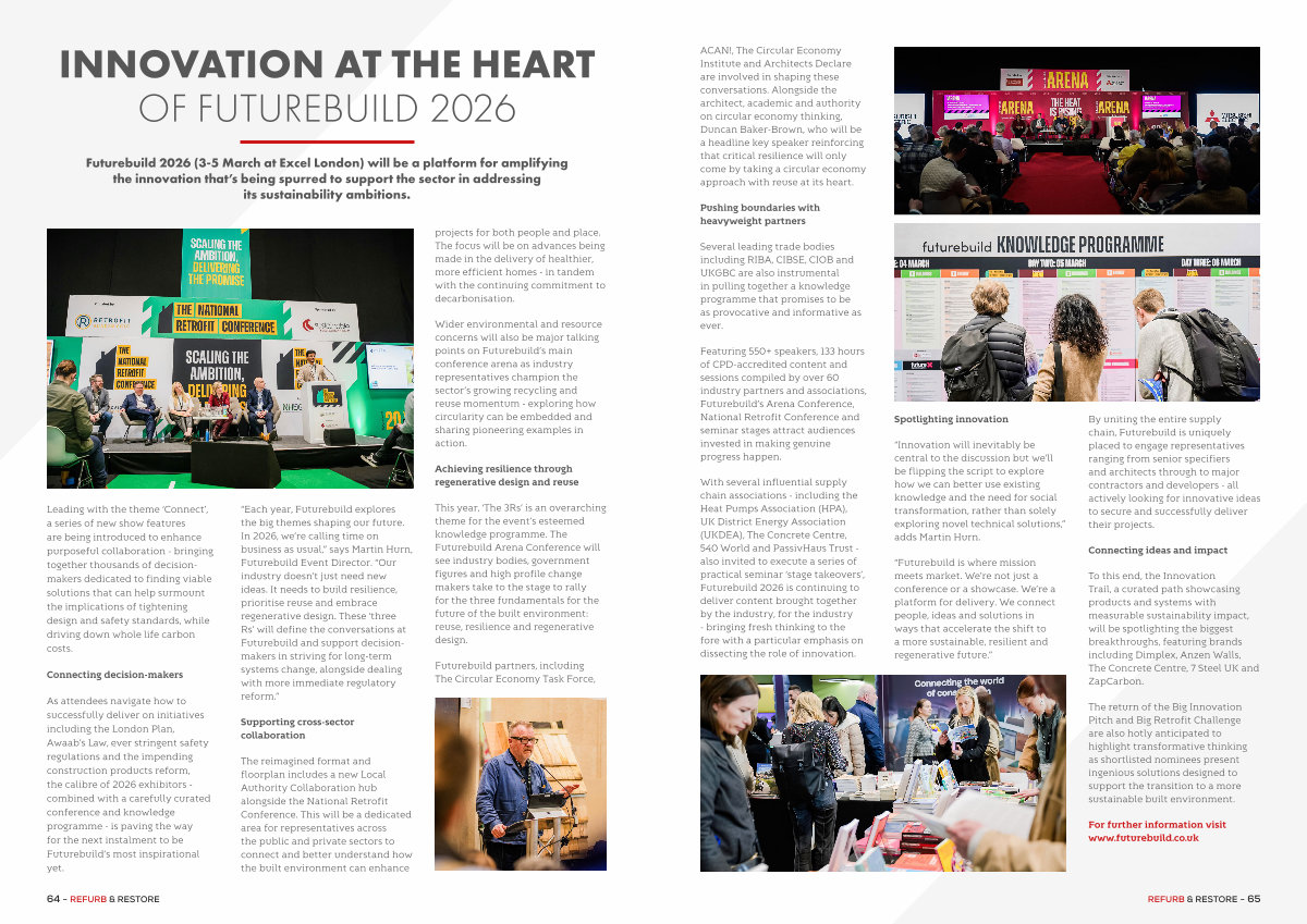 “ Each year, Futurebuild explores the big themes shaping our future. In 2026, we’ re calling time on business as usual,” says Martin Hurn, Futurebuild Event Director.“ Our industry doesn’ t just need new ideas. It needs to build resilience, prioritise reuse and embrace regenerative design. These‘ three Rs’ will define the conversations at Futurebuild and support decisionmakers in striving for long-term systems change, alongside dealing with more immediate regulatory reform.”