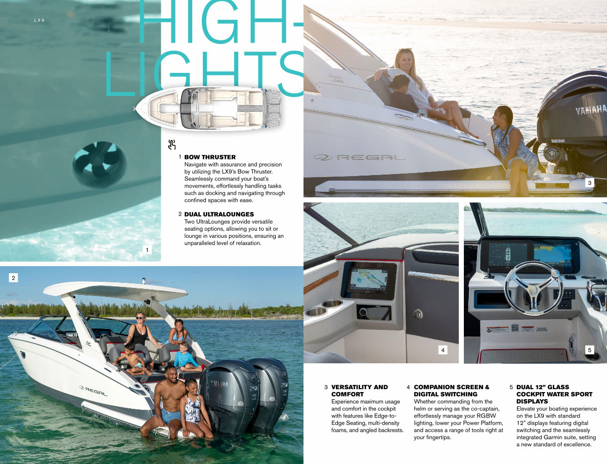 DUAL 12” GLASS COCKPIT WATER SPORT DISPLAYS Elevate your boating experience on the LX9 with standard 12” displays featuring digital switching and the seamlessly integrated Garmin suite, setting a new standard of excellence. |