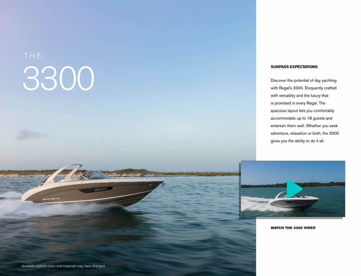 Discover the potential of day yachting with Regal’ s 3300. Eloquently crafted with versatility and the luxury that is promised in every Regal. The spacious layout lets you comfortably accommodate up to 18 guests and entertain them well. Whether you seek adventure, relaxation or both, the 3300 gives you the ability to do it all.