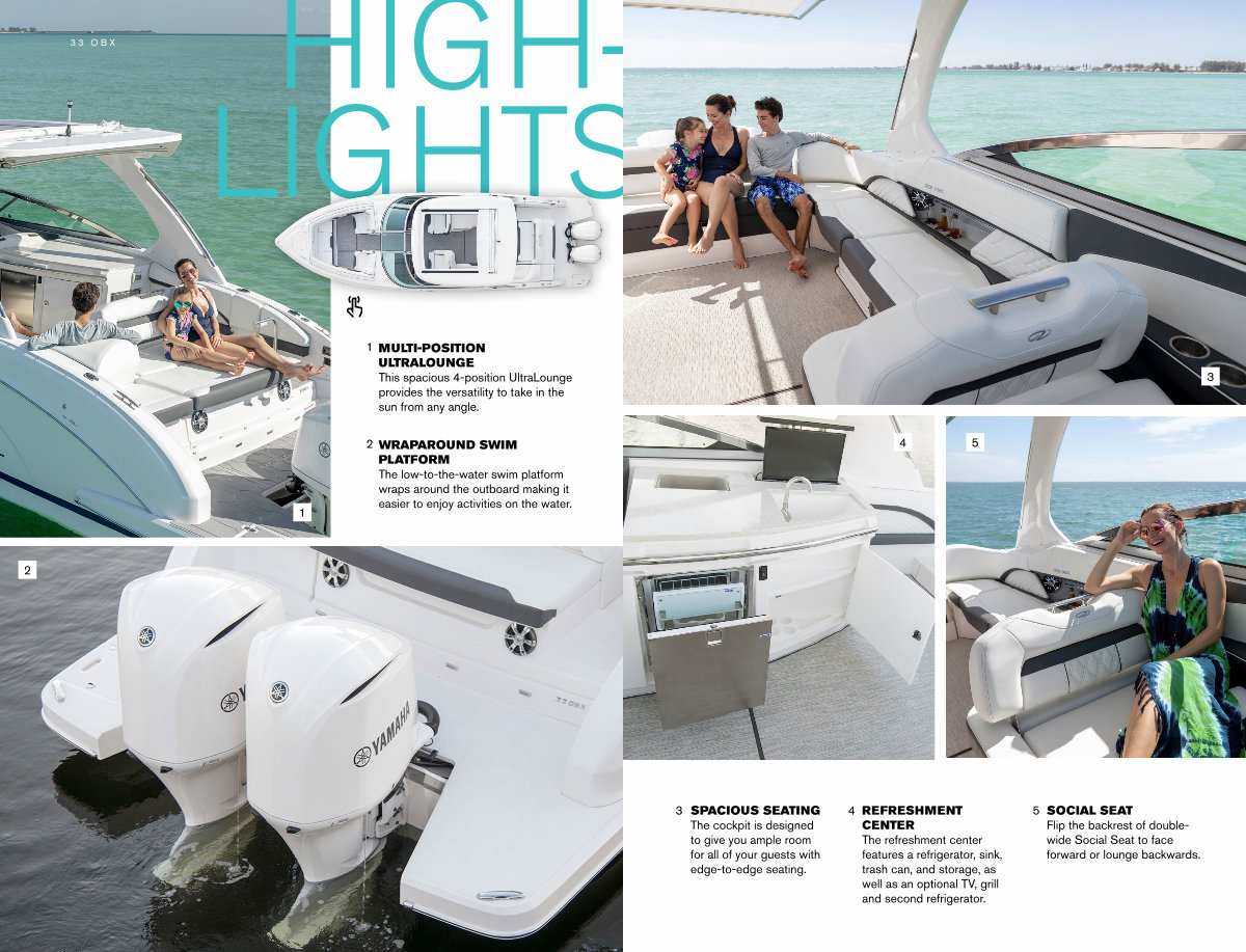 REFRESHMENT CENTER The refreshment center features a refrigerator, sink, trash can, and storage, as well as an optional TV, grill and second refrigerator. |