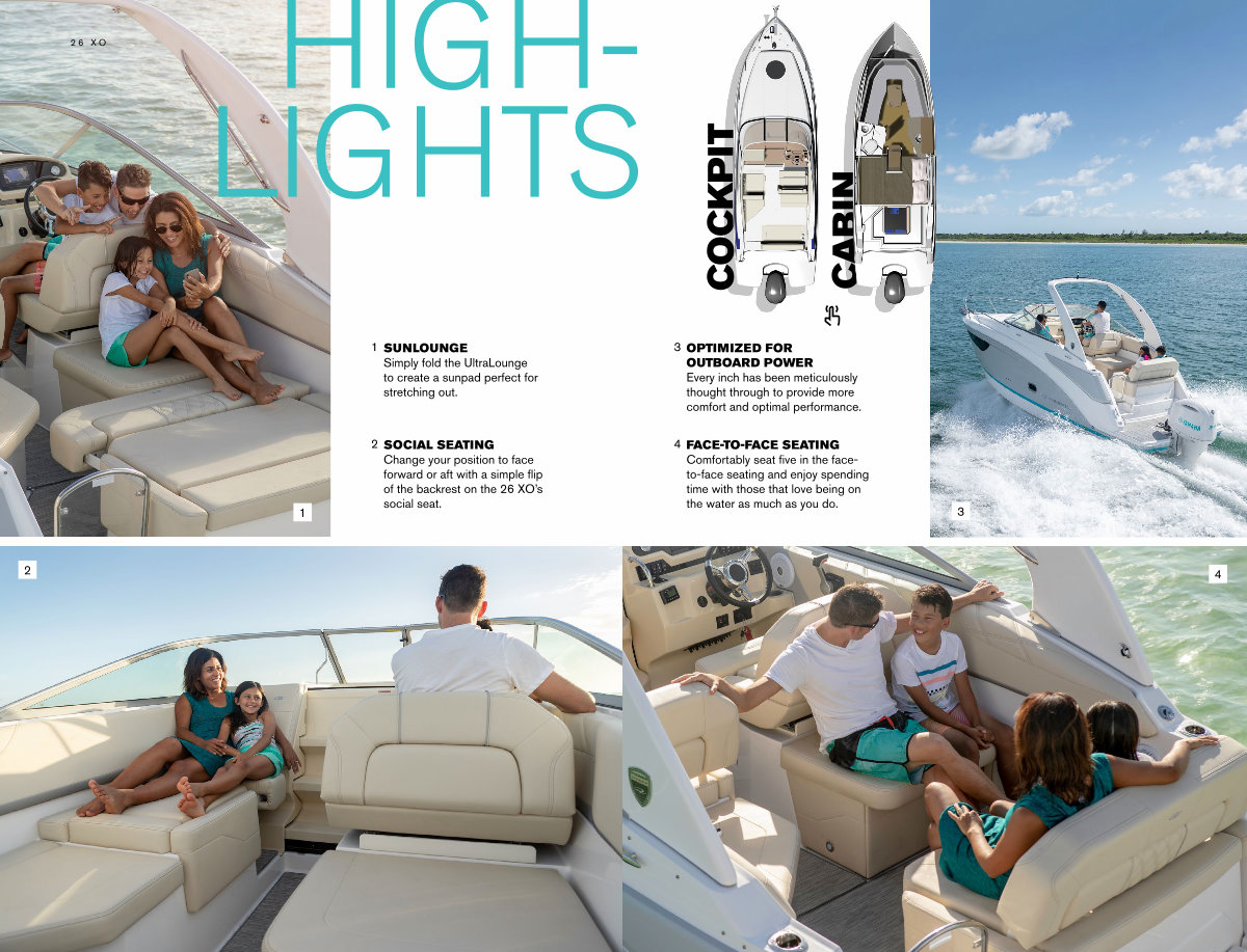 SOCIAL SEATING Change your position to face forward or aft with a simple flip of the backrest on the 26 XO’ s social seat.