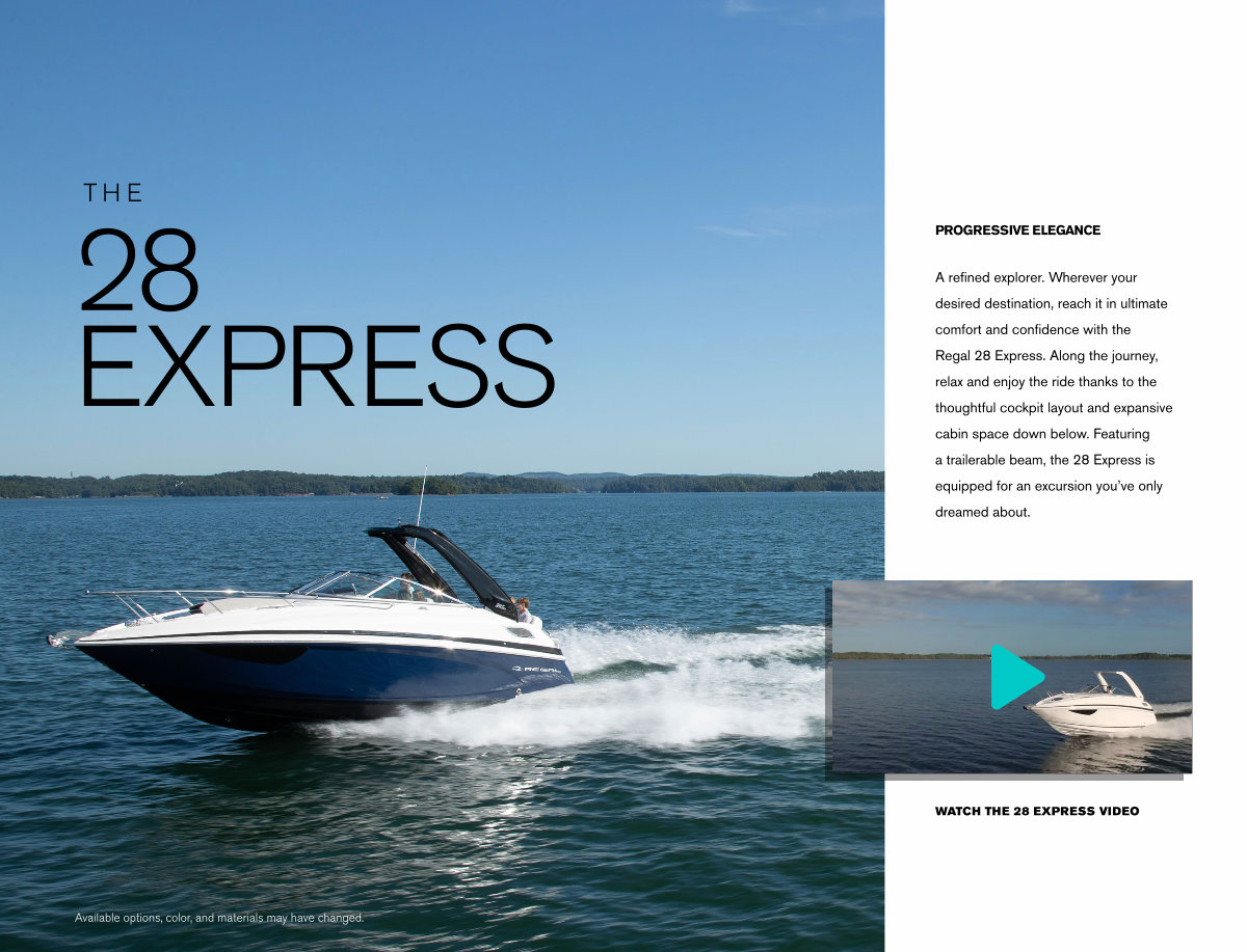 A refined explorer. Wherever your desired destination, reach it in ultimate comfort and confidence with the Regal 28 Express. Along the journey, relax and enjoy the ride thanks to the thoughtful cockpit layout and expansive cabin space down below. Featuring a trailerable beam, the 28 Express is equipped for an excursion you’ ve only dreamed about.