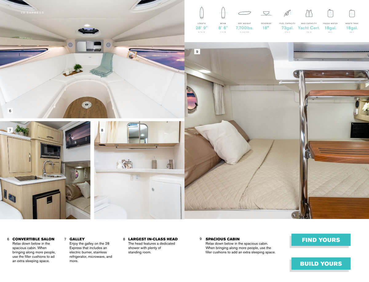 7 GALLEY Enjoy the galley on the 28 Express that includes an electric burner, stainless refrigerator, microwave, and more. |