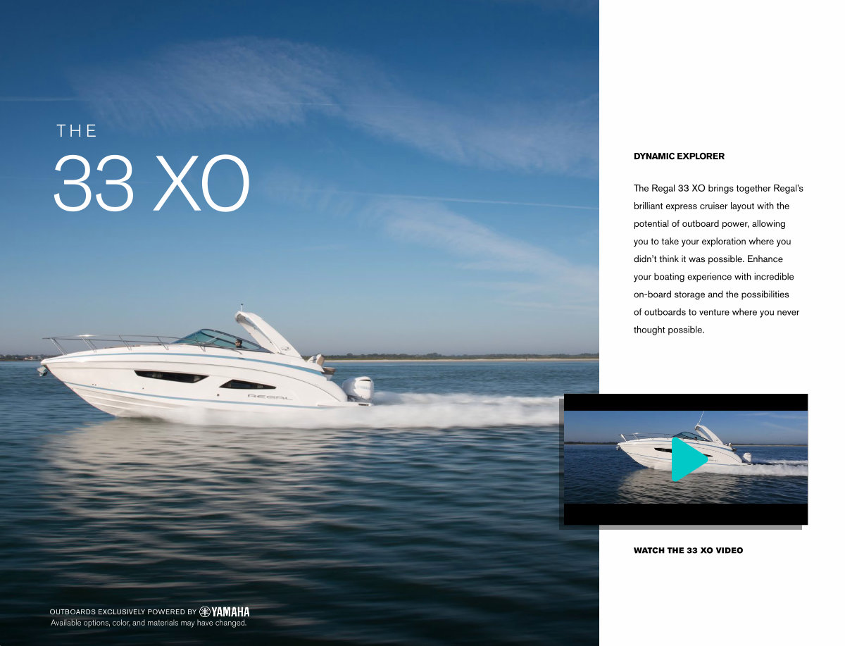 The Regal 33 XO brings together Regal’ s brilliant express cruiser layout with the potential of outboard power, allowing you to take your exploration where you didn’ t think it was possible. Enhance your boating experience with incredible on-board storage and the possibilities of outboards to venture where you never thought possible.