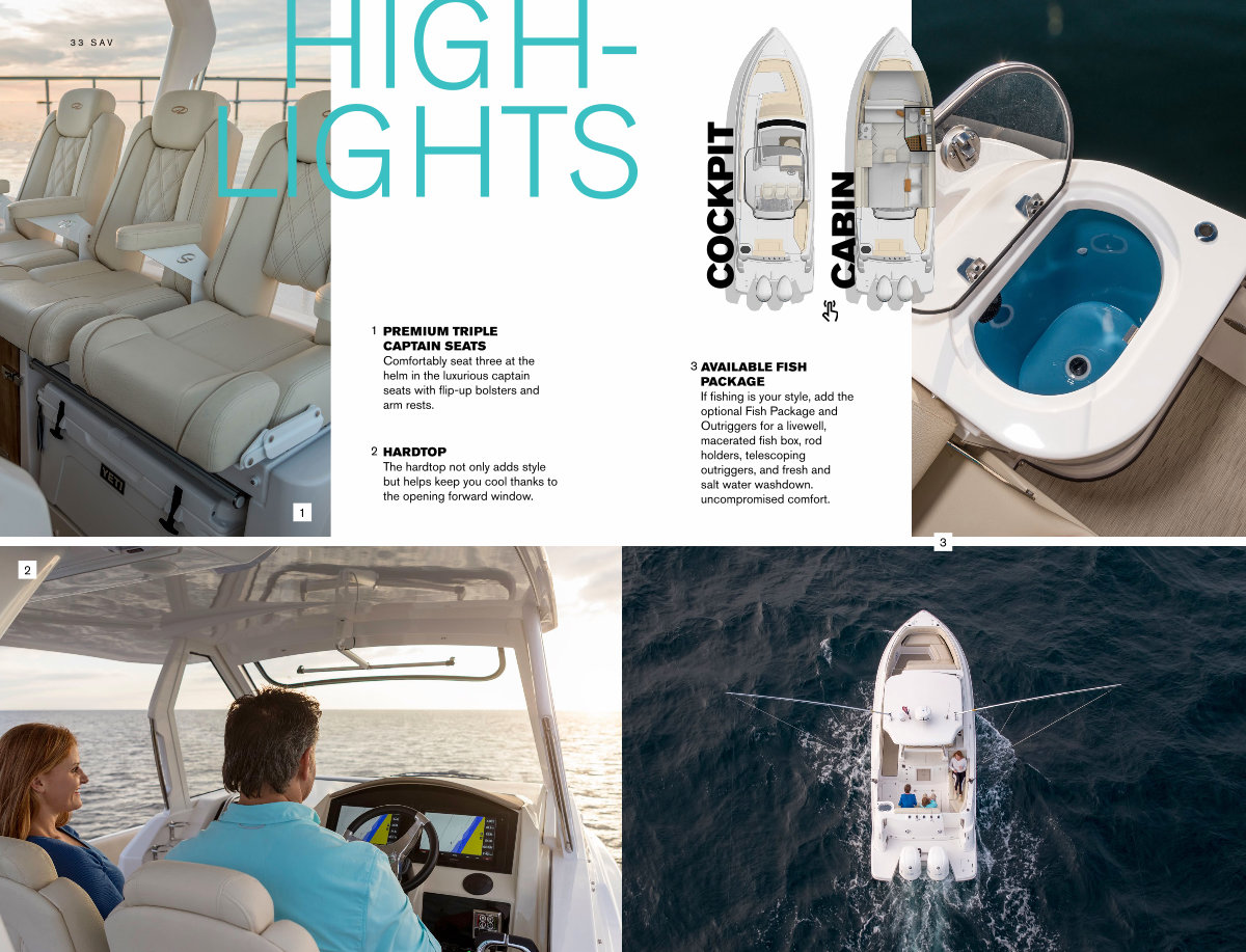 PREMIUM TRIPLE CAPTAIN SEATS Comfortably seat three at the helm in the luxurious captain seats with flip-up bolsters and arm rests.