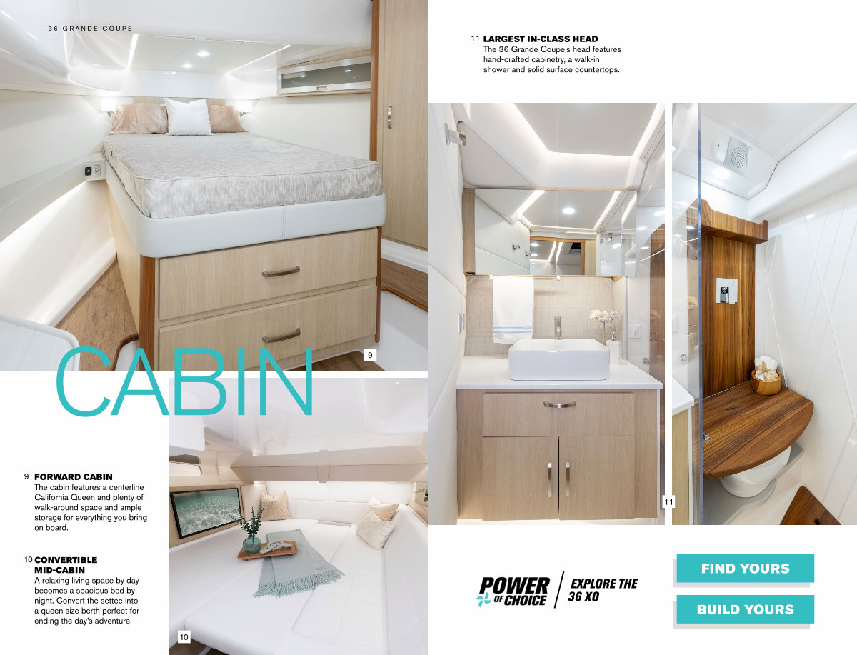 11 LARGEST IN-CLASS HEAD The 36 Grande Coupe’ s head features hand-crafted cabinetry, a walk-in shower and solid surface countertops.