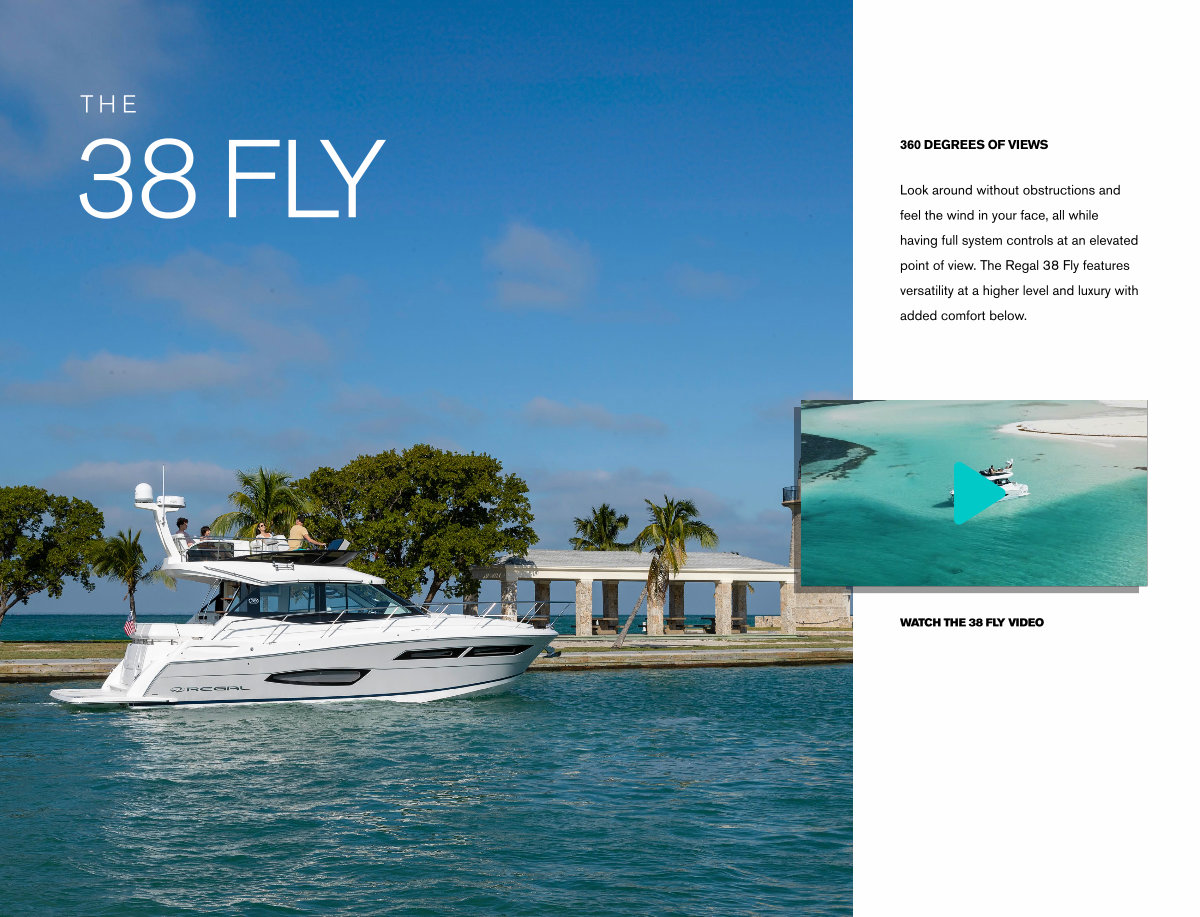 Look around without obstructions and feel the wind in your face, all while having full system controls at an elevated point of view. The Regal 38 Fly features versatility at a higher level and luxury with added comfort below.