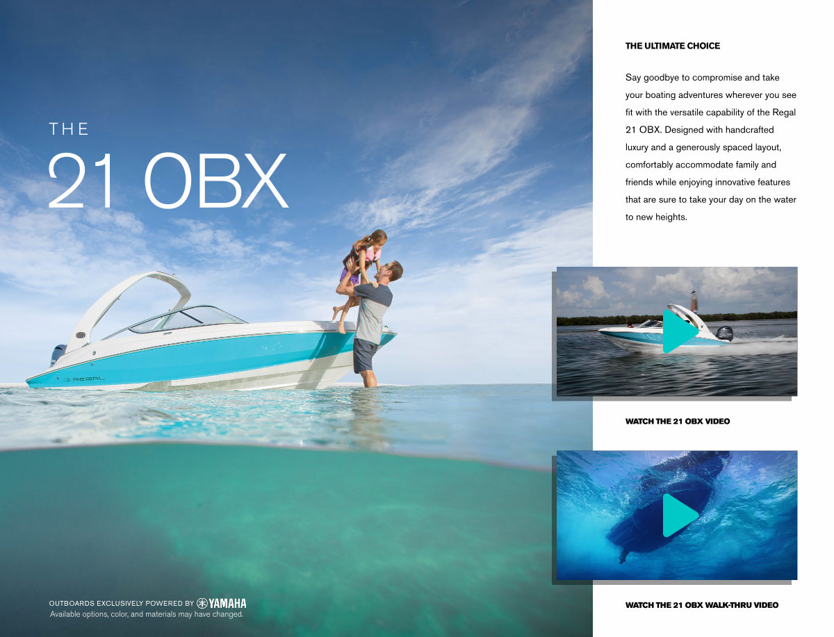Say goodbye to compromise and take your boating adventures wherever you see fit with the versatile capability of the Regal 21 OBX. Designed with handcrafted luxury and a generously spaced layout, comfortably accommodate family and friends while enjoying innovative features that are sure to take your day on the water to new heights.