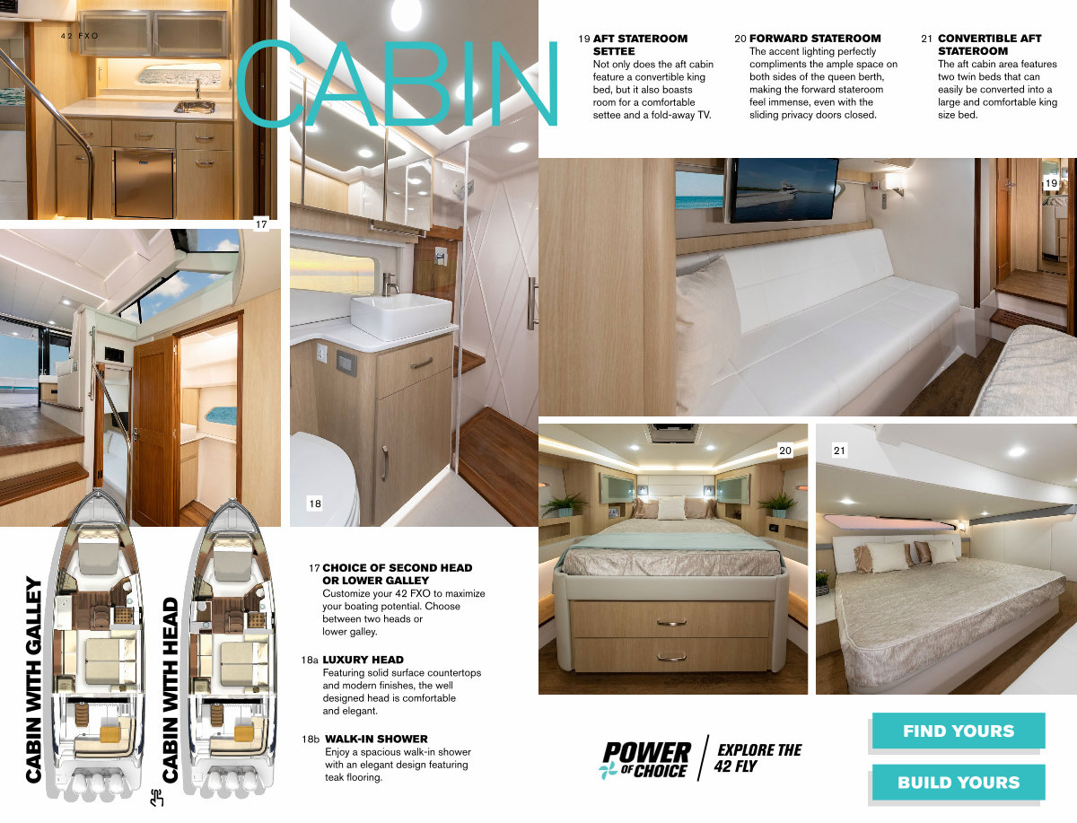 17 CHOICE OF SECOND HEAD OR LOWER GALLEY Customize your 42 FXO to maximize your boating potential. Choose between two heads or lower galley.