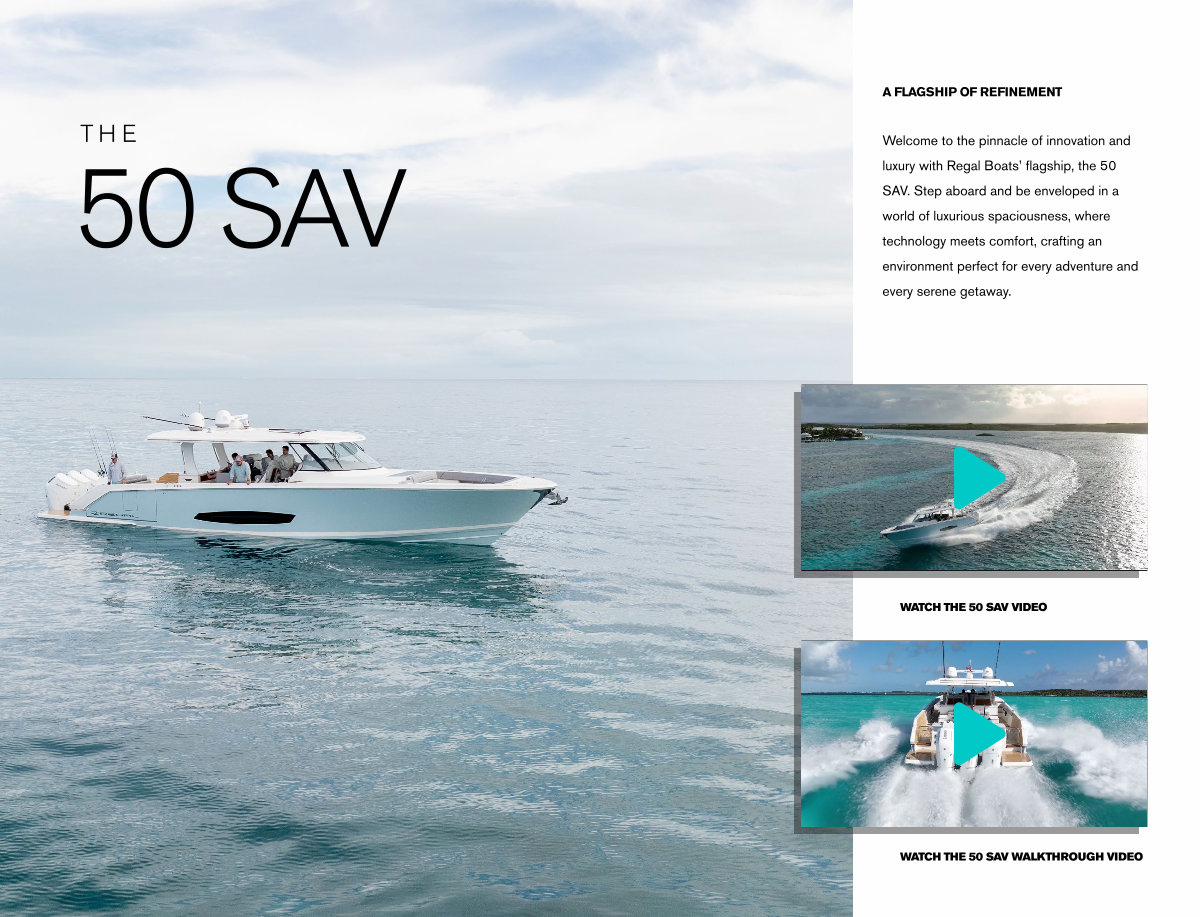 Welcome to the pinnacle of innovation and luxury with Regal Boats’ flagship, the 50 SAV. Step aboard and be enveloped in a world of luxurious spaciousness, where technology meets comfort, crafting an environment perfect for every adventure and every serene getaway.