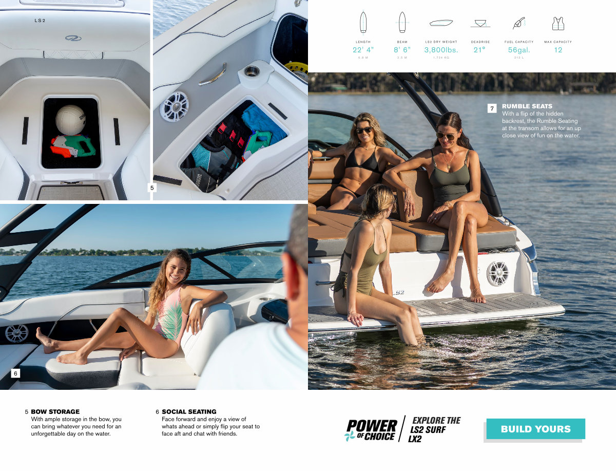 RUMBLE SEATS With a flip of the hidden backrest, the Rumble Seating at the transom allows for an up close view of fun on the water.