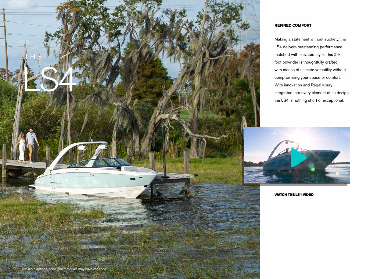 Making a statement without subtlety, the LS4 delivers outstanding performance matched with elevated style. This 24- foot bowrider is thoughtfully crafted with means of ultimate versatility without compromising your space or comfort. With innovation and Regal luxury integrated into every element of its design, the LS4 is nothing short of exceptional.