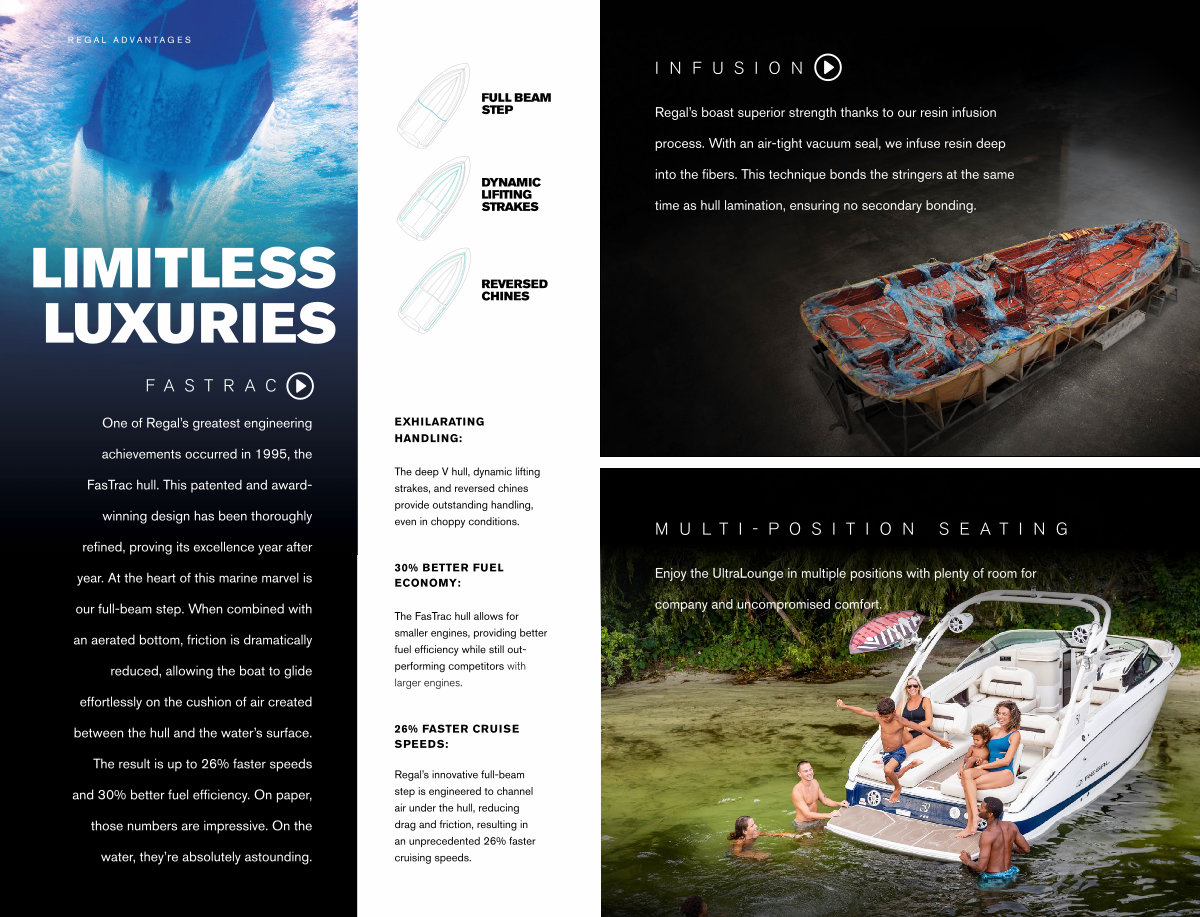 Regal’ s innovative full-beam step is engineered to channel air under the hull, reducing drag and friction, resulting in an unprecedented 26 % faster cruising speeds.