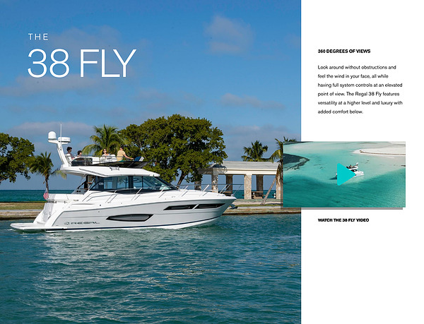 Look around without obstructions and feel the wind in your face , all while having full system controls at an elevated point of view . The Regal 38 Fly features versatility at a higher level and luxury with added comfort below .