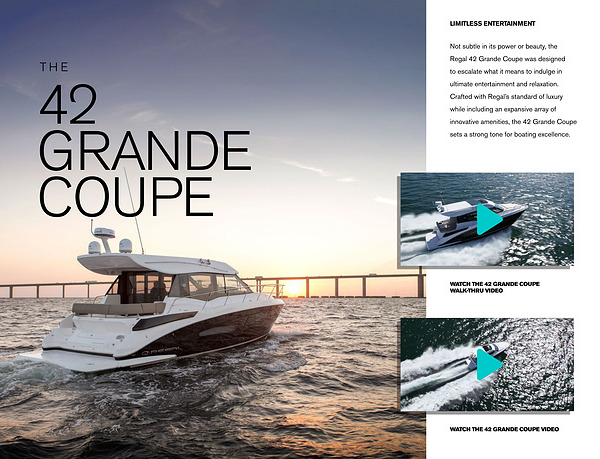 Not subtle in its power or beauty , the Regal 42 Grande Coupe was designed to escalate what it means to indulge in ultimate entertainment and relaxation . Crafted with Regal ’ s standard of luxury while including an expansive array of innovative amenities , the 42 Grande Coupe sets a strong tone for boating excellence .