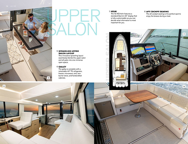 SPRAWLING UPPER SALON LAYOUT This innovative sprawling layout seamlessly blends the upper salon and aft patio into one immense open space .