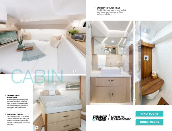 11 LARGEST IN-CLASS HEAD The 36 XO ’ s head features hand-crafted cabinetry , a walk-in shower and solid surface countertops .
