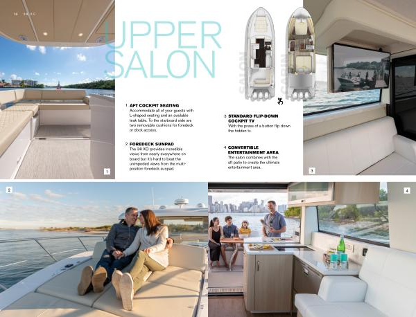 FOREDECK SUNPAD The 38 XO provides incredible views from nearly everywhere on board but it ’ s hard to beat the unimpeded views from the multiposition foredeck sunpad .