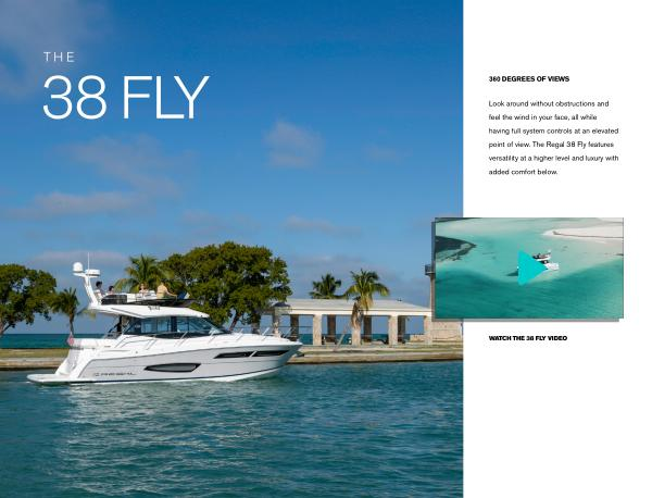 Look around without obstructions and feel the wind in your face , all while having full system controls at an elevated point of view . The Regal 38 Fly features versatility at a higher level and luxury with added comfort below .
