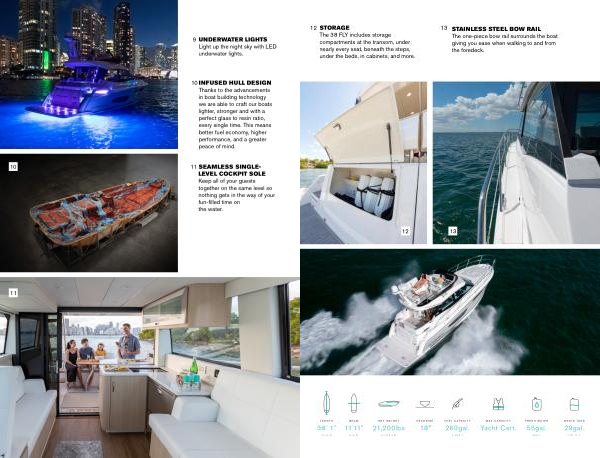 The 38 FLY includes storage compartments at the transom , under nearly every seat , beneath the steps , under the beds , in cabinets , and more . |