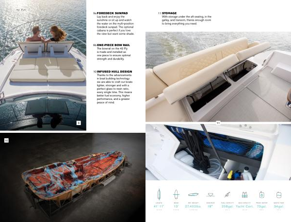 9b ONE-PIECE BOW RAIL The bowrail on the 42 Fly is made and installed as one piece to ensure optimal strength and durability .