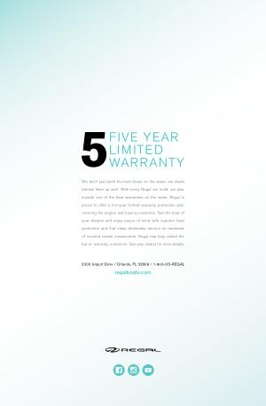We don ’ t just build the best boats on the water ; we stand behind them as well . With every Regal we build , we also include one of the best warranties on the water . Regal is proud to offer a five-year limited warranty protection plan covering the engine and boat accessories . Get the boat of your dreams and enjoy peace of mind with superior boat protection and first class dealership service on hundreds of covered vessel components . Regal has truly raised the bar on warranty protection . See your dealer for more details .