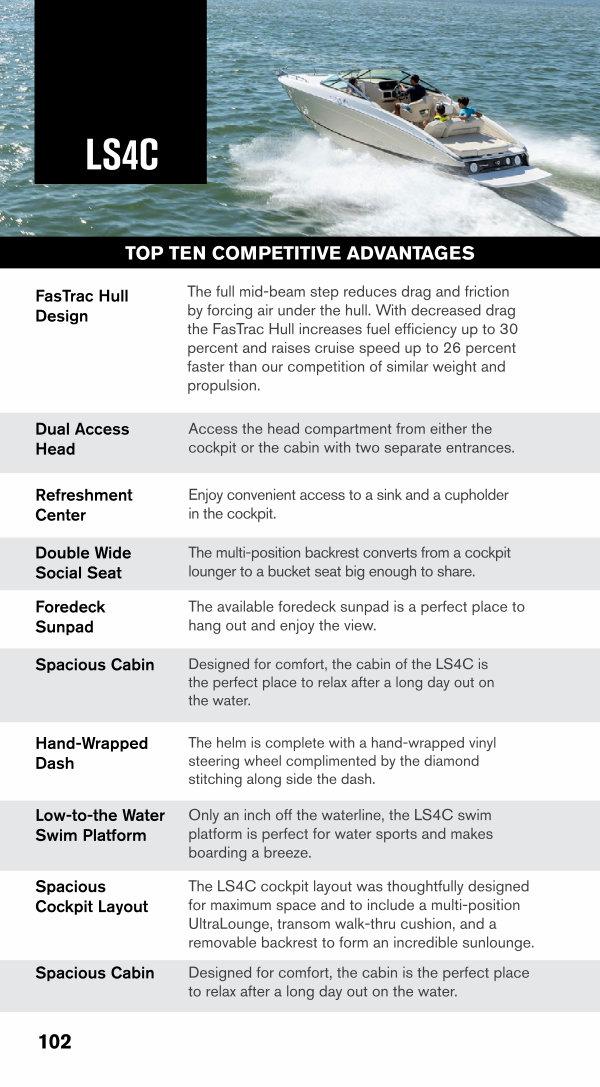 The LS4C cockpit layout was thoughtfully designed for maximum space and to include a multi-position UltraLounge, transom walk-thru cushion, and a removable backrest to form an incredible sunlounge.