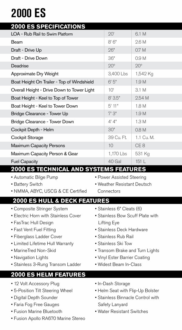 LOA- Rub Rail to Swim Platform Beam 8’ 6” 2.6 M Draft- Drive Up Draft- Drive Down Deadrise Approximate Dry Weight Boat Height On Trailer- Top of Windshield Overall Height- Drive Down to Tower Light Boat Height- Keel to Top of Tower Boat Height- Keel to Tower Down Bridge Clearance- Tower Up Bridge Clearance- Tower Down Cockpit Depth- Helm Cockpit Storage Maximum Capacity Persons Maximum Capacity Person & Gear Fuel Capacity