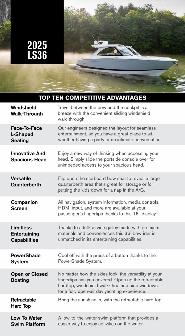 Thanks to a full-service galley made with premium materials and conveniences this 36’ bowrider is unmatched in its entertaining capabilities.