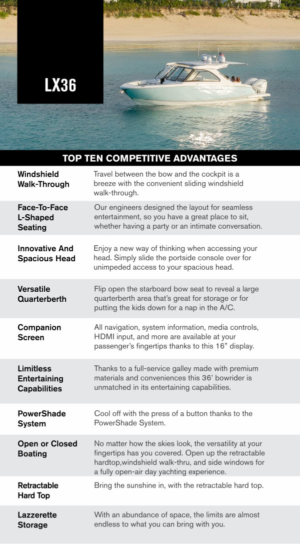 Thanks to a full-service galley made with premium materials and conveniences this 36’ bowrider is unmatched in its entertaining capabilities.