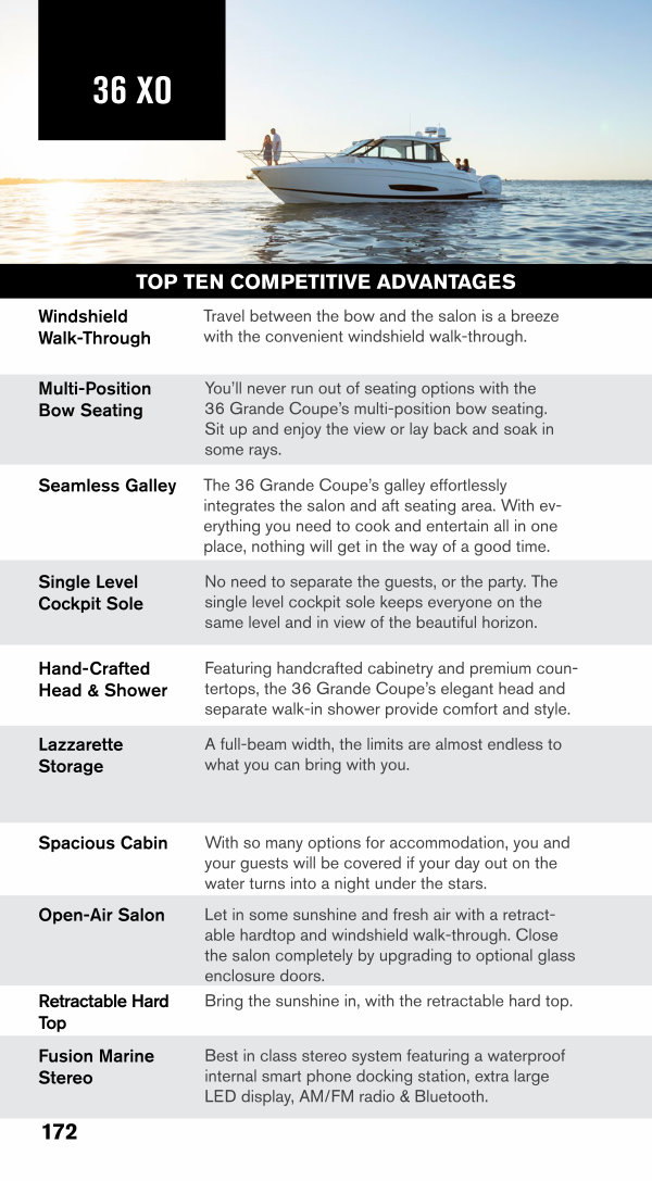 You’ ll never run out of seating options with the 36 Grande Coupe’ s multi-position bow seating. Sit up and enjoy the view or lay back and soak in some rays.
