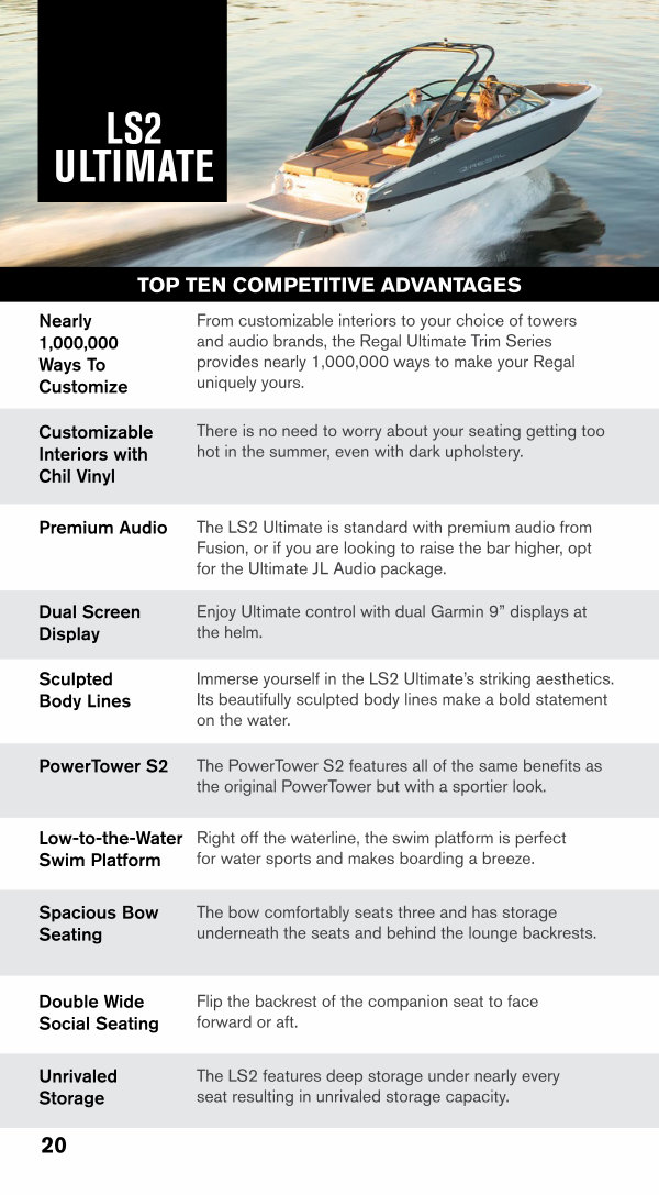 From customizable interiors to your choice of towers and audio brands, the Regal Ultimate Trim Series provides nearly 1,000,000 ways to make your Regal uniquely yours.
