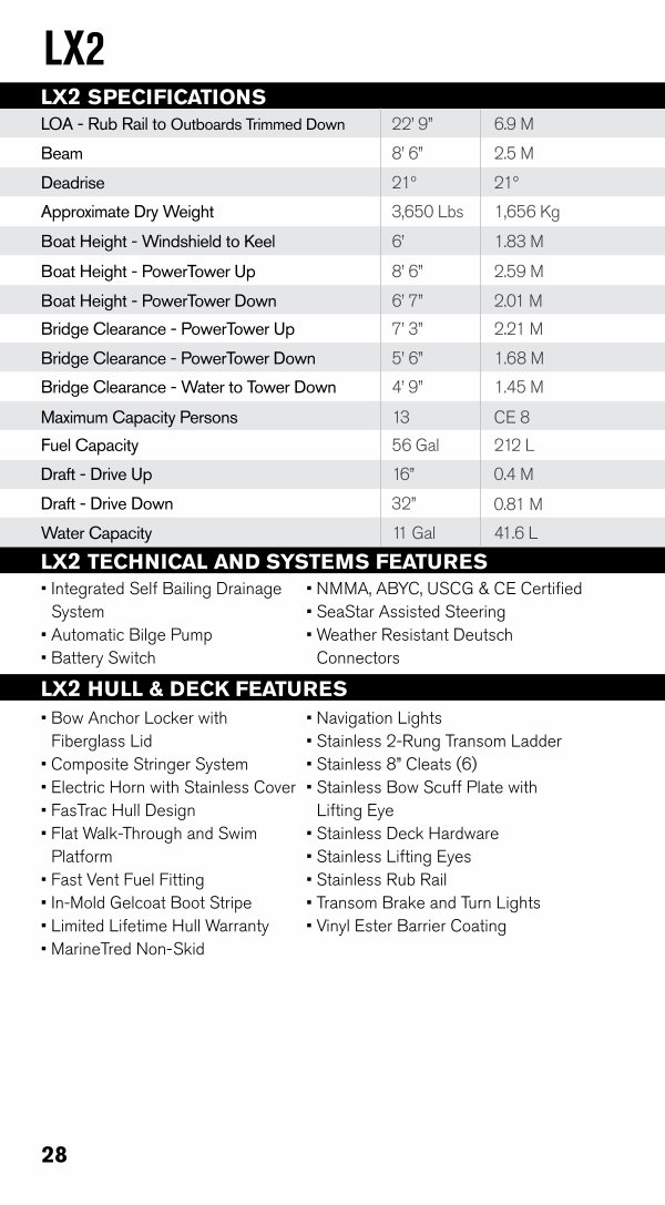 LOA- Rub Rail to Outboards Trimmed Down Beam 8’ 6” 2.5 M Deadrise Approximate Dry Weight Boat Height- Windshield to Keel Boat Height- PowerTower Up Boat Height- PowerTower Down Bridge Clearance- PowerTower Up Bridge Clearance- PowerTower Down Bridge Clearance- Water to Tower Down Maximum Capacity Persons Fuel Capacity Draft- Drive Up Draft- Drive Down Water Capacity