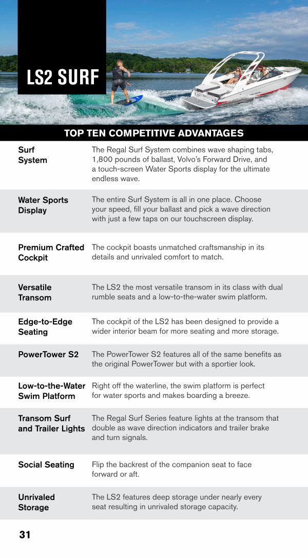 The Regal Surf System combines wave shaping tabs, 1,800 pounds of ballast, Volvo’ s Forward Drive, and a touch-screen Water Sports display for the ultimate endless wave.