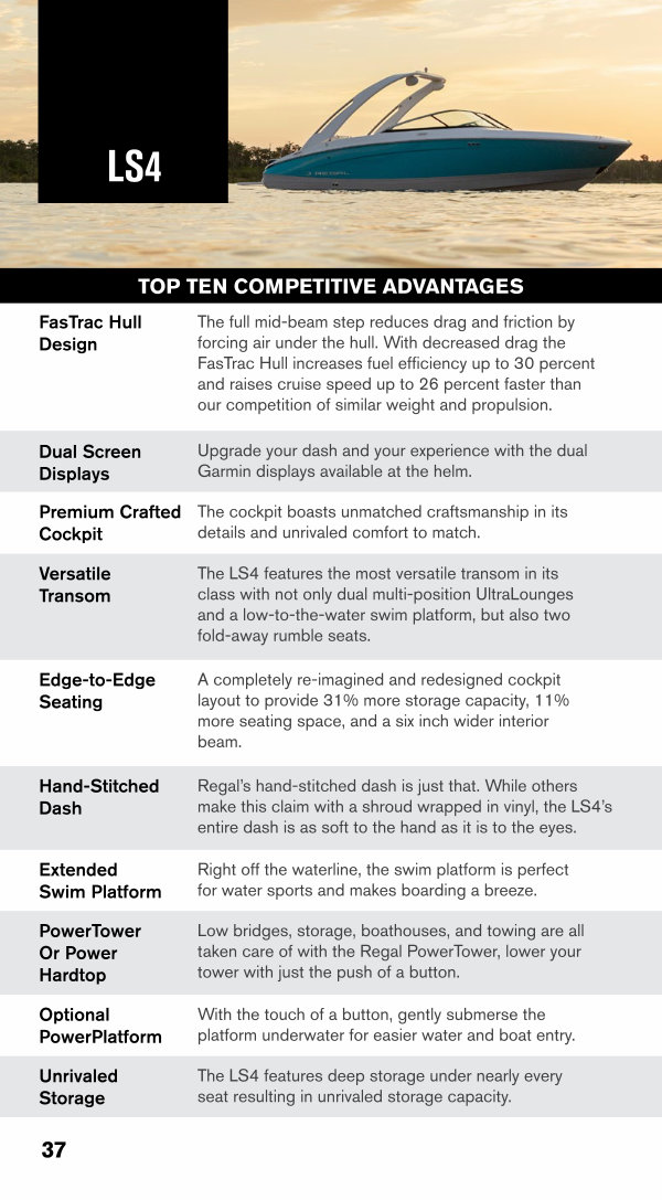 The LS4 features the most versatile transom in its class with not only dual multi-position UltraLounges and a low-to-the-water swim platform, but also two fold-away rumble seats.