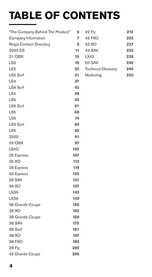 TABLE OF CONTENTS“ The Company Behind The Product” Company Information Regal Contact Directory 2000 ES 21 OBX LS2 LX2 LS2 Surf LS4 LS4 Surf LX4 LS6 LS6 Surf LX6 LS9 LS9 Surf LX9 3300 33 OBX LS4C 26 Express 26 XO 28 Express 33 Express 33 SAV 33 XO LS36 LX36 36 Grande Coupe 36 XO 38 Grande Coupe 38 SAV 38 Surf 38 XO 38 FXO 38 Fly 42 Grande Coupe 42 Fly 42 FXO 42 XO 43 SAV LX43 50 SAV Technical Glossary Marketing 6 7 8 11 15 19 25 31 37 43 49 55 61 68 74 80 85 91 97 102 107 113 119 125 131 137 143 149 155 162 169 175 181 187 193 200 206 213 220 227 233 238 242 246 250 4