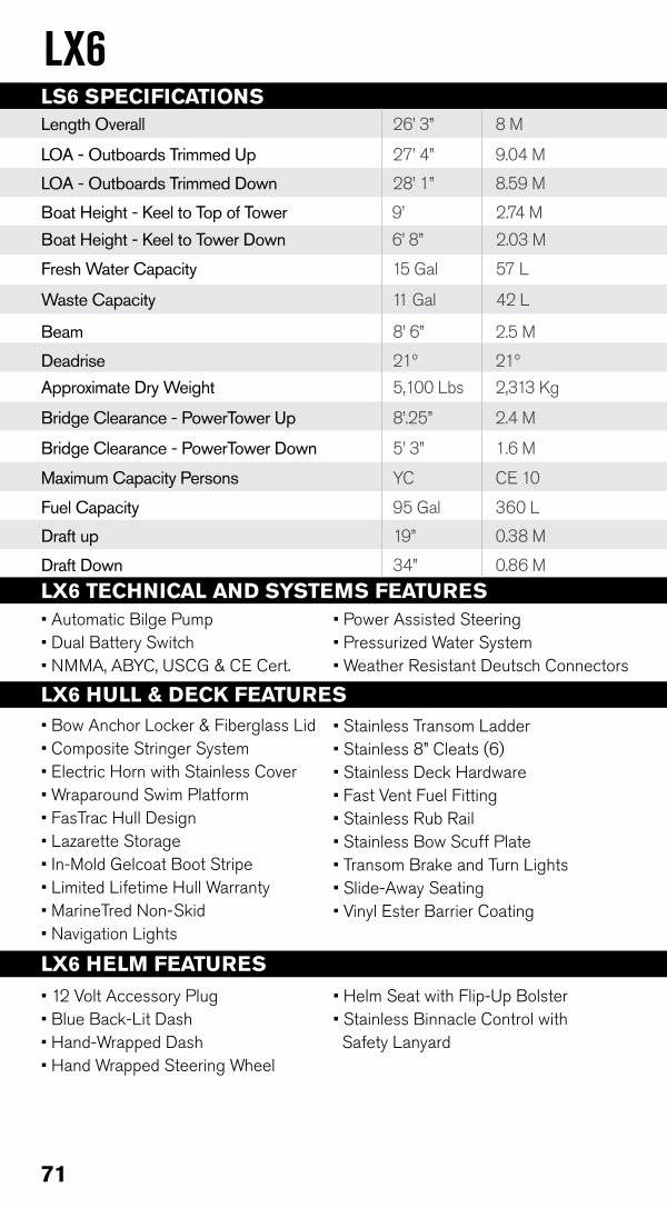 Length Overall LOA- Outboards Trimmed Up LOA- Outboards Trimmed Down Boat Height- Keel to Top of Tower Boat Height- Keel to Tower Down Fresh Water Capacity Waste Capacity Beam 8’ 6” 2.5 M Deadrise Approximate Dry Weight Bridge Clearance- PowerTower Up Bridge Clearance- PowerTower Down Maximum Capacity Persons Fuel Capacity Draft up Draft Down