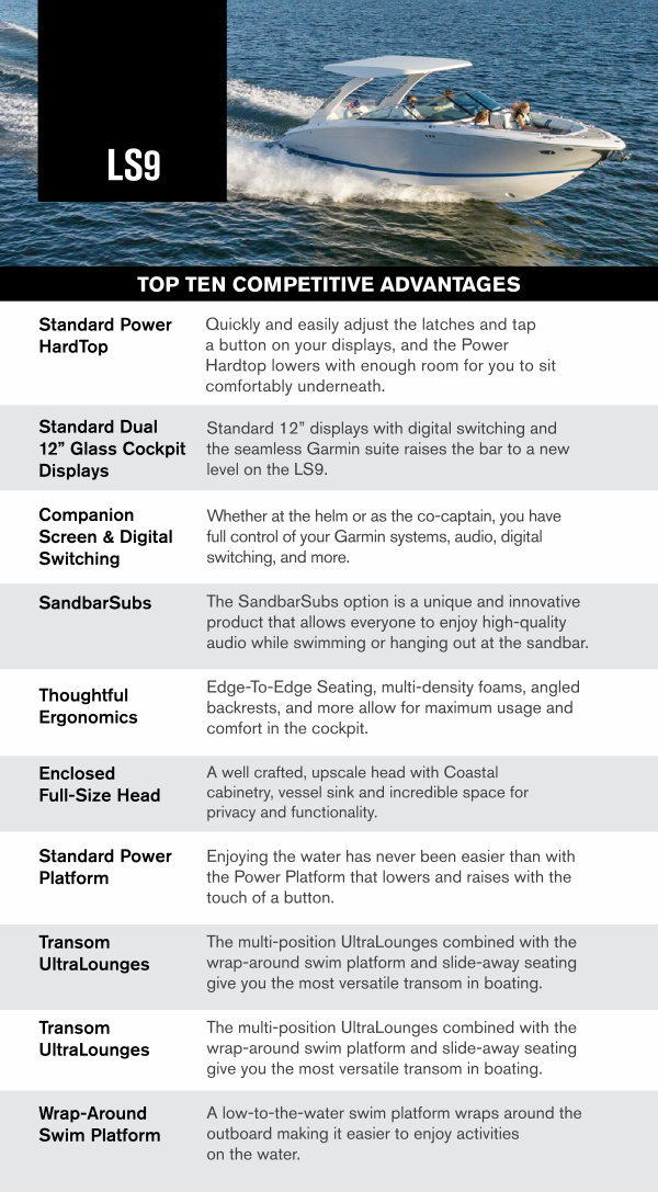 Standard 12” displays with digital switching and the seamless Garmin suite raises the bar to a new level on the LS9.